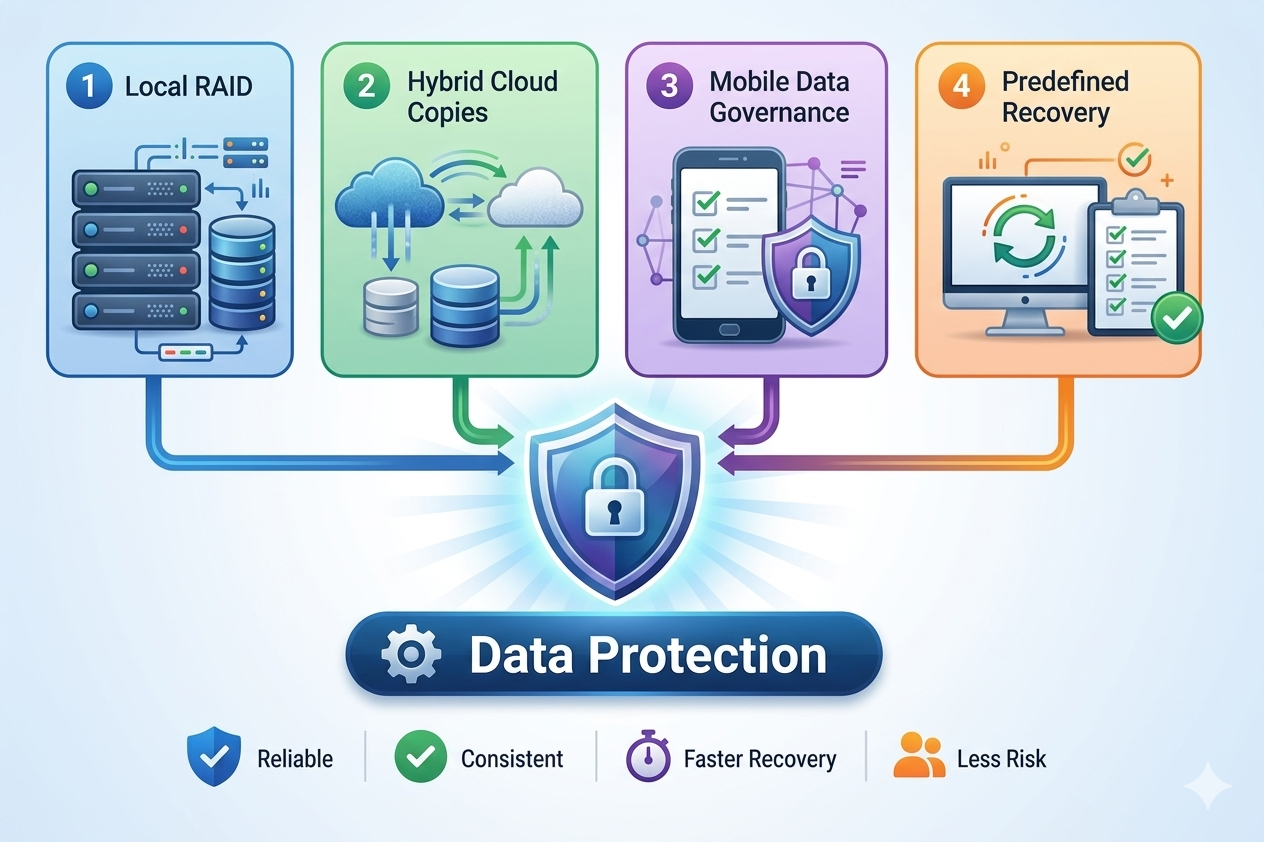 When local RAID storage, hybrid cloud copies, mobile data governance, and predefined recovery behavior are designed into the same model, data protection stops being a management demand and starts becoming an engineering property.