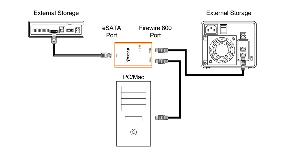S2F directly shares power from Firewire port with no any extra power requirement, and connects to all STARDOM storage RAID products or other brand storage products which are with eSATA port.
