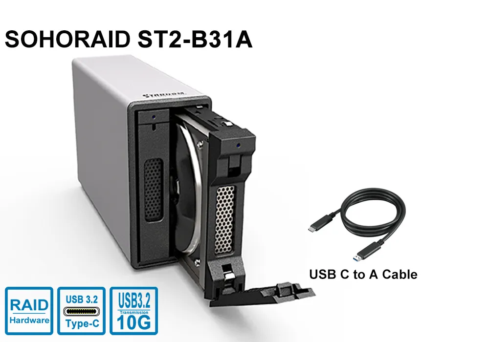 The ST2-B31A is a versatile storage solution, offering support for both 2.5" and 3.5" SATA drives. With multiple RAID modes and compatibility with PC, Mac. Key features include hot-swappable drives, a quiet fan with manual control, and user-friendly RAIDON STATUSGUARD GUI software. Its aluminum construction provides durability while remaining lightweight. Altogether, the ST2-B31A delivers a powerful, adaptable, and user-friendly data storage experience.
