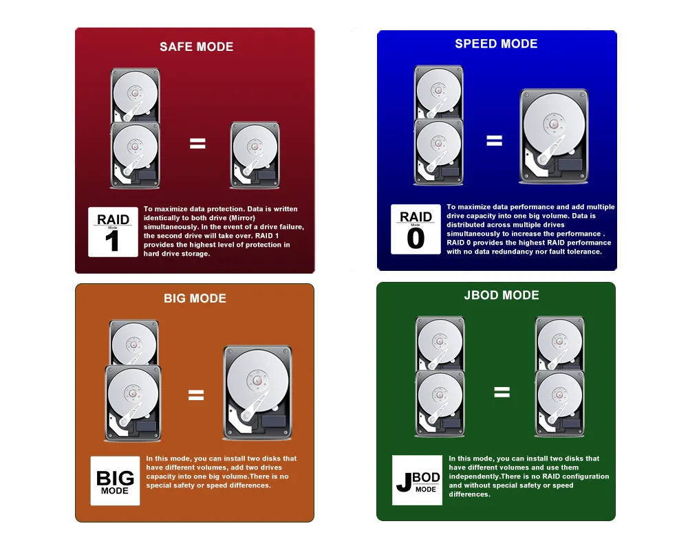 | Storage Mode | BIG Mode JBOD - Independent Mode RAID 0 - Speed Mode RAID 1 - Safe Mode |