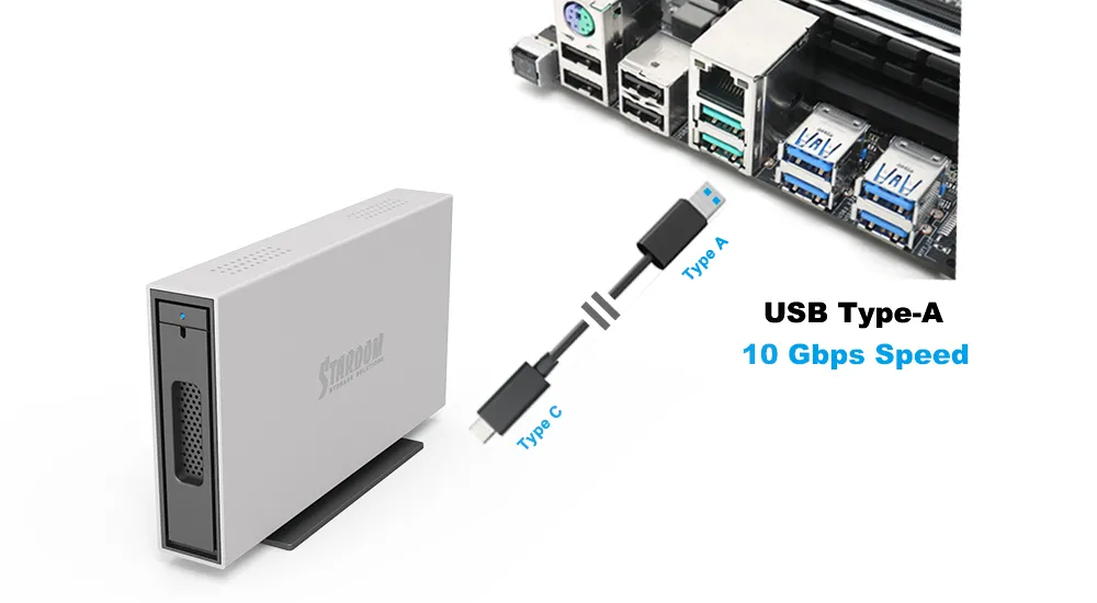 iTANK i310-B31A ensures broad interface support, accommodating host computers equipped with either USB Type-A port. This feature provides users with extensive connectivity options. Regardless of your computer's USB interface, the docking station seamlessly integrates with it, guaranteeing smooth and efficient data transfer processes. Whether your system is the latest model with USB Type-A, our docking station ensures complete compatibility, delivering a versatile solution for your data storage needs.