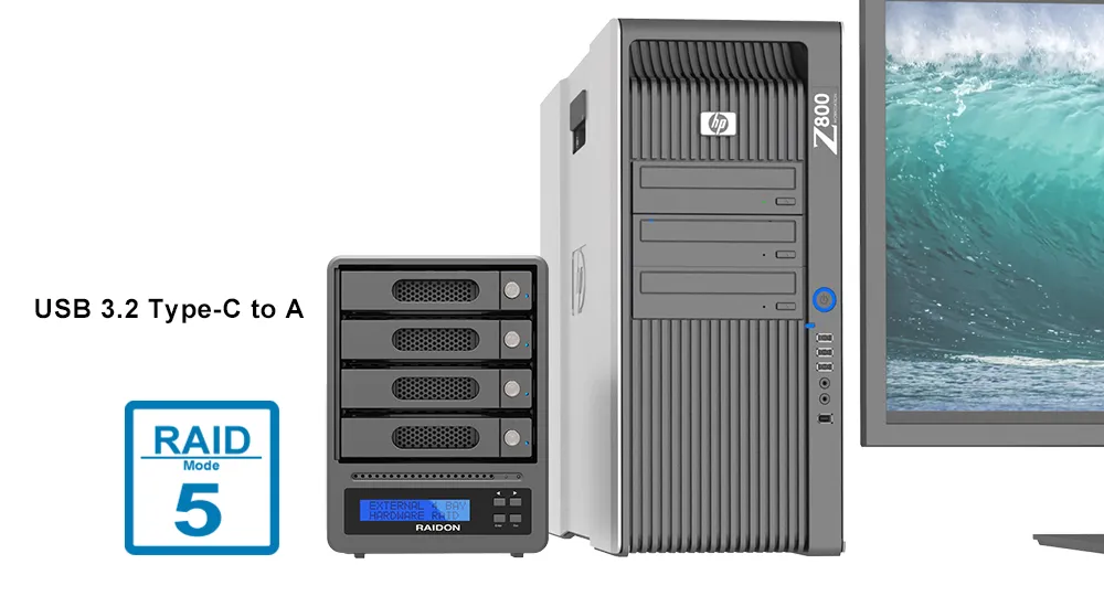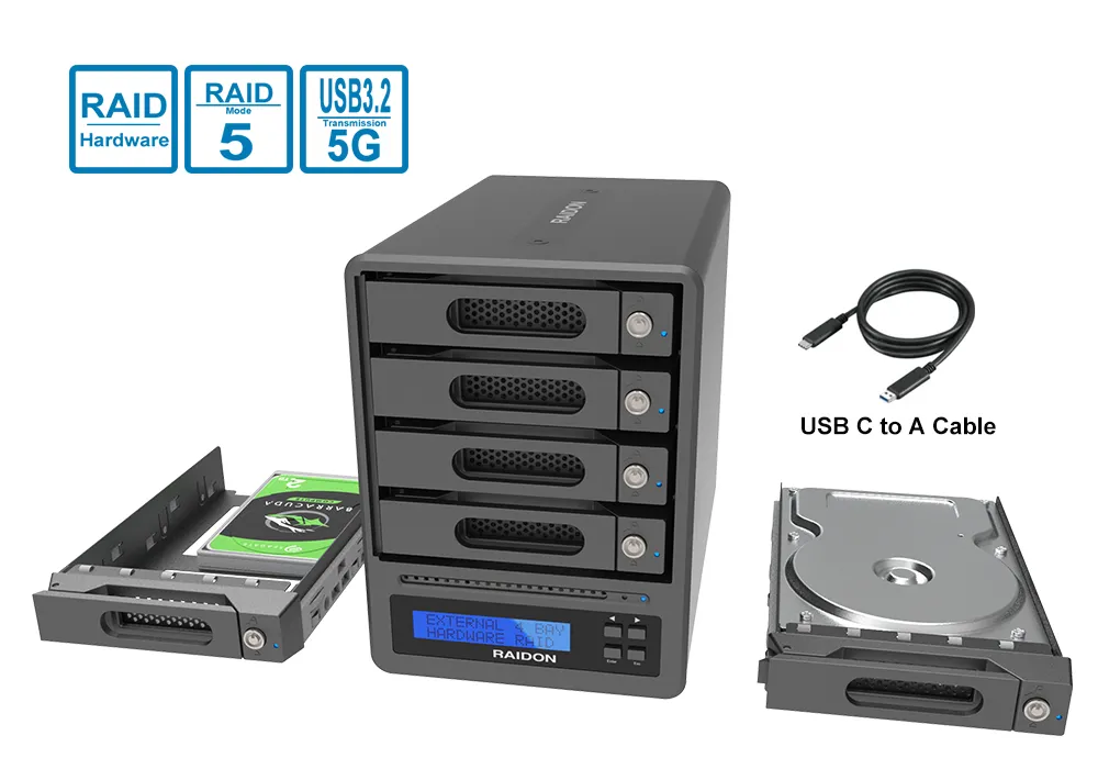 A robust 4-BAY Hardware RAID5 storage solution, designed for both 2.5" & 3.5" SATA III HDD/SSD. Features include 24W USB Power Delivery, a Display Port (DP1.1a) for dual monitor setup, and USB 3.2 compatibility for Type-C. Enhanced features with hot-swappable drives, an intuitive LCM display and unique feature of charge back feature.