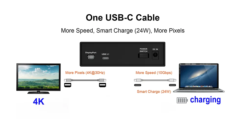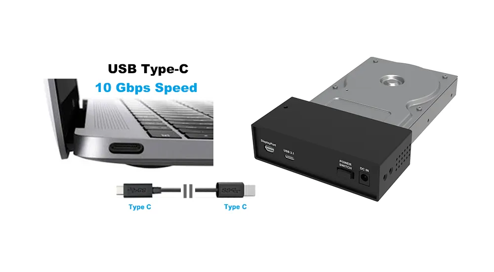 USB 3.2 Gen 2 Type-C, One USB 3.2 Gen2 Type-C port which supports 24W USB Power Delivery, And One Mini DisplayPort for DP1.1a, Hot-Swappable Drive