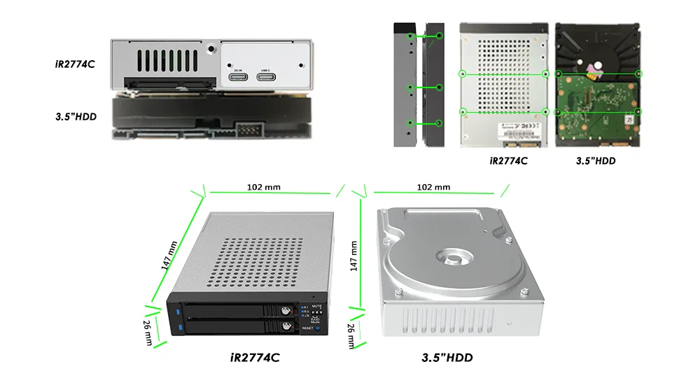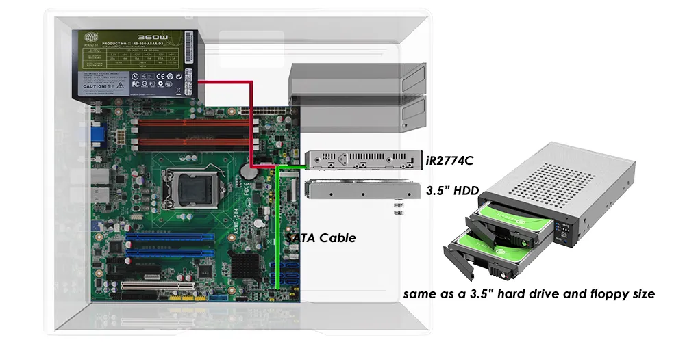 The iR2774C fits into a single floppy drive bay, making it an efficient solution for space-constrained setups. Despite its small form factor, it supports two 2.5" HDDs or SSDs, offering ample storage for most applications.