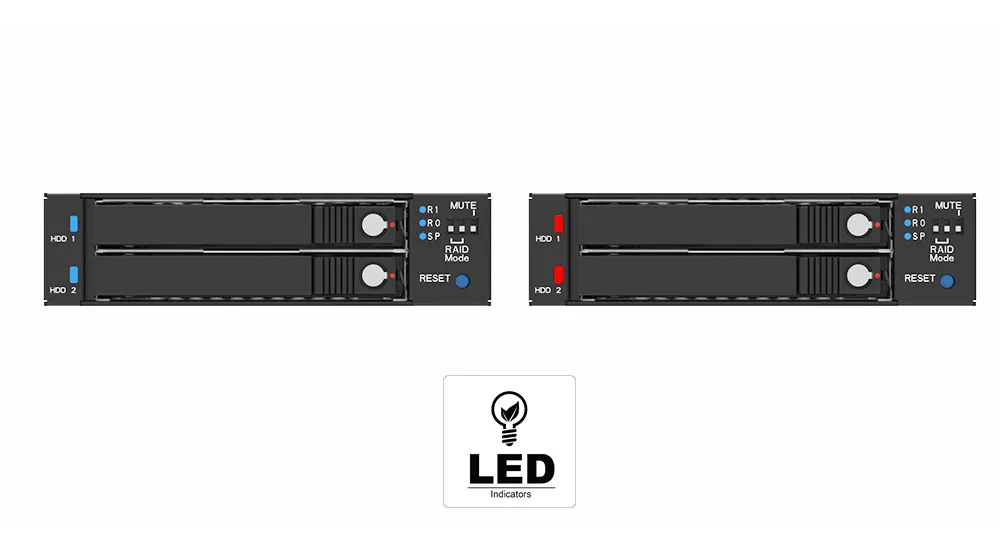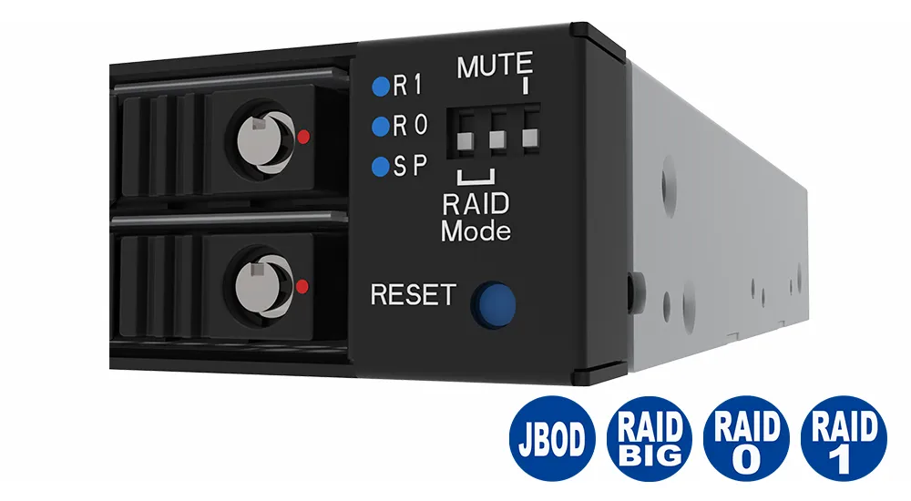 The iR2774C enables users to adjust the RAID settings through the front panel, simplifying the configuration process. With the front panel switch, users can effortlessly choose from four modes – RAID 1, RAID 0, JBOD, or SPAN (BIG) – depending on their application needs. Moreover, users have the option to conveniently deactivate the buzzer under any condition, utilizing the front panel switch according to their preferences.