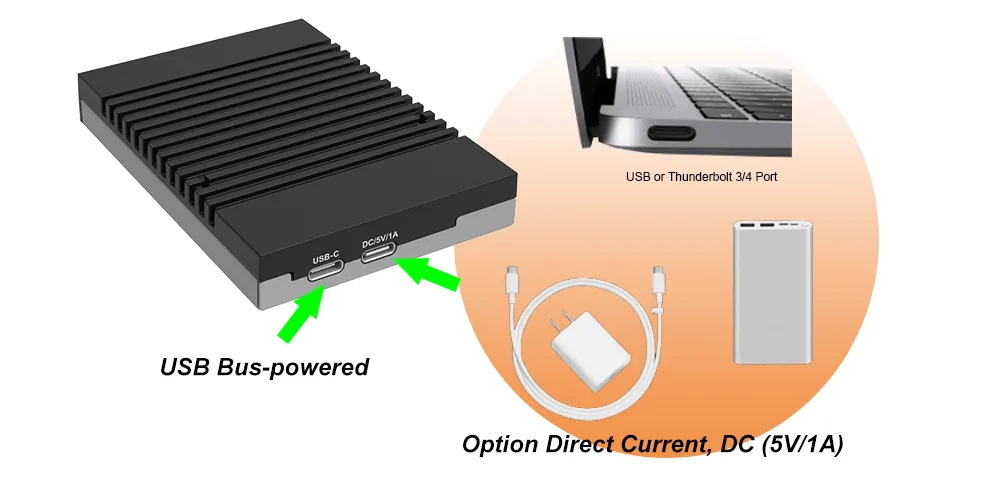 The UBOX-B4BP's design allows it to be powered either through a USB bus or an optional 5V DC input. This ensures that users can access their data even in scenarios where a dedicated power source might not be available.