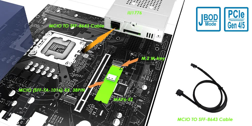 The MAP6-EZ transforms your M.2 socket into an MCIO connector, allowing you to extend and relocate the socket outside the computer chassis for convenient access to NVMe SSDs.