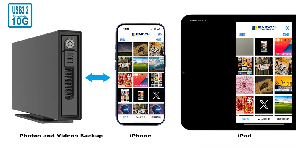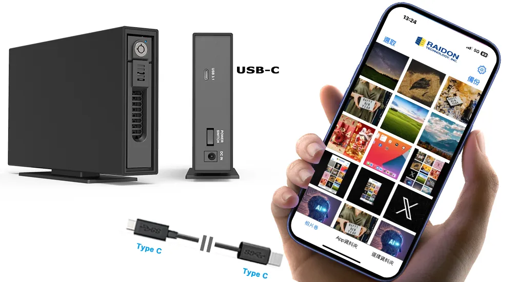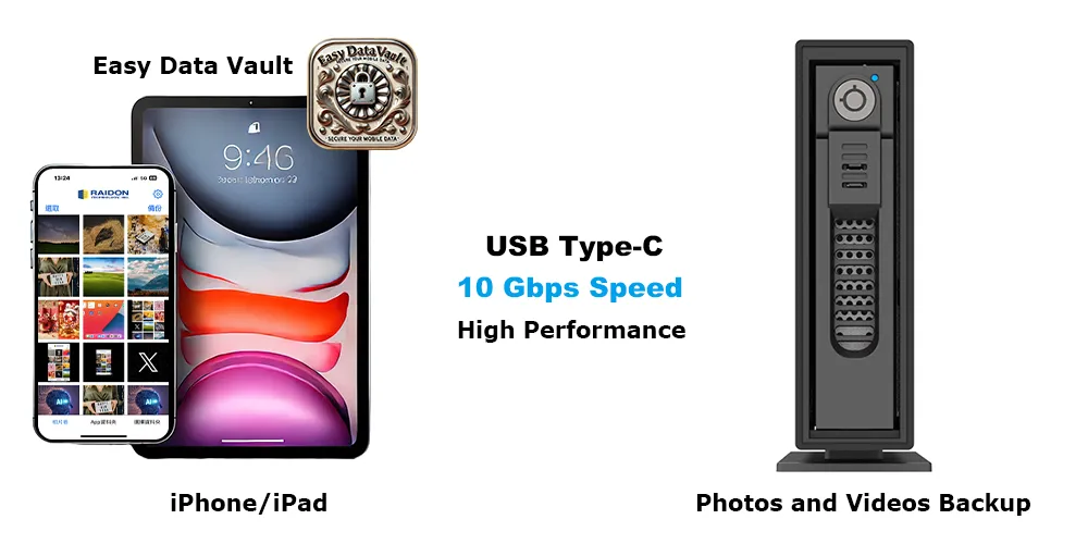 Enhance your storage and backup capabilities with the RAIDON GT1670-B31 Series (GT1670-B31 & GT1670-BA31) and Easy Data Vault app for iPhone 15 and later (with USB-C). This powerful pairing combines high-speed hardware with an intuitive mobile app, delivering efficient and secure data management.