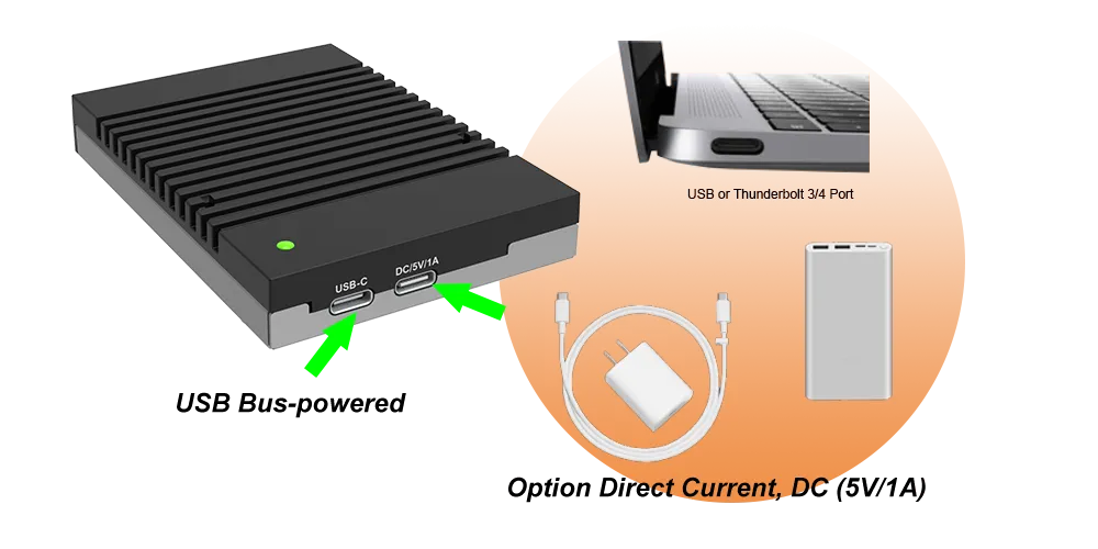 The design of UBOX-B4BP+ allows it to be powered either through a USB bus or an optional 5V DC input. This ensures that users can access their data even in scenarios where a dedicated power source might not be available.