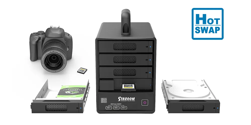 • Flexible JBOD Configuration: Supports a "Just a Bunch Of Disks" setup, accommodating three individual 2.5" or 3.5" SATA HDD/SSD drives and one CFexpress Type B memory card. Access each storage medium independently for ultimate workflow control.