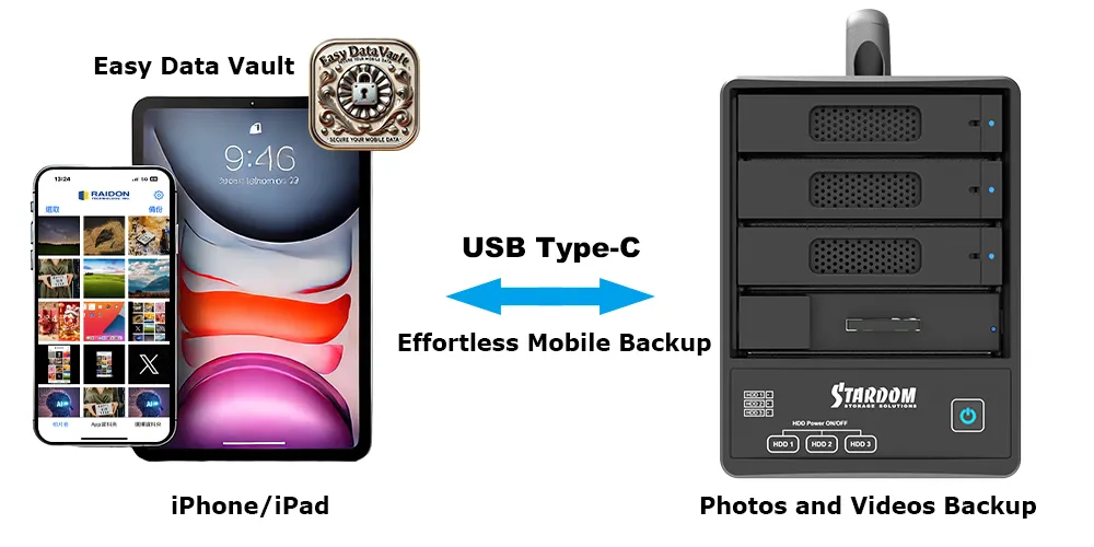 The ST4F-B32 integrates seamlessly with iOS devices through the Easy Data Vault app, making it especially attractive to iPhone and iPad users (designed for iPhone 15 and later models). It enables effortless backup and management of photos, videos, and other files directly from mobile devices, offering a convenient solution for Apple users needing to offload large files.
