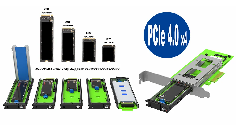 4. Flexibility: Whether you’re installing in a full-sized desktop tower or a compact SFF case, the PC04M-EZ has you covered with interchangeable full-height and low-profile brackets. The adapter supports any M.2 NVMe SSD from 30mm to 80mm, giving you the freedom to choose the best drive for your needs. Its tray can even accommodate both single-sided and double-sided M.2 modules, and with motherboard support it allows convenient hot-swapping of drives for minimal downtime.