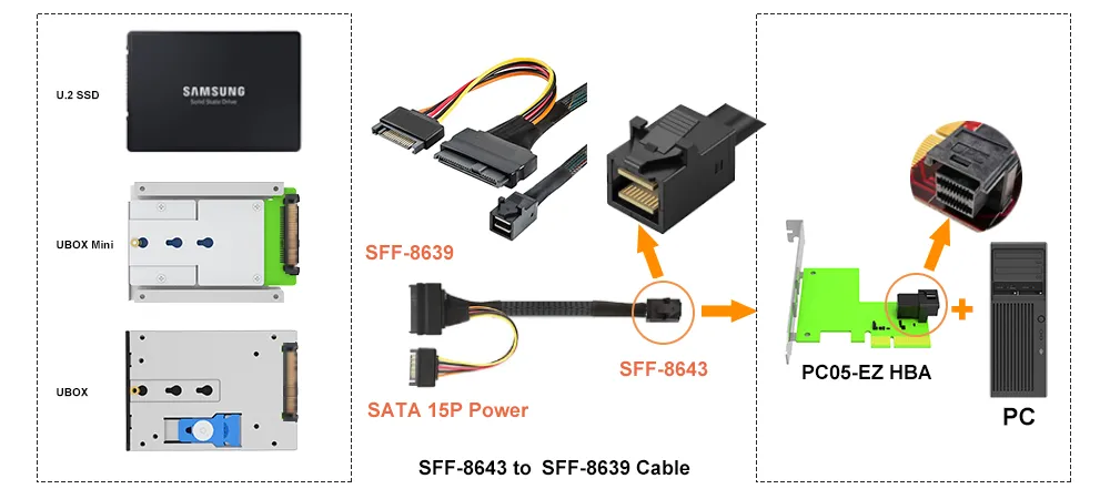 1. Advanced Interface Support: The PC05-EZ-I is equipped with a mini SAS(SFF-8643)connection interface, ensuring a robust and reliable connection. This feature-rich adapter supports NVMe and PCI Express 3.0 and 4.0 interfaces, offering unparalleled data transfer speeds and efficiency.
