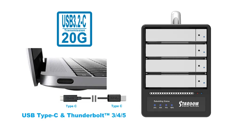 The SR4-B32 is a 4-bay hardware RAID enclosure engineered for professional workflows that demand data protection and high-bandwidth USB-C connectivity. It supports USB 3.2 Gen 2x2 (up to 20Gbps) and connects to Thunderbolt™ 3/4 computers via their USB-C ports as a USB storage device, as well as USB 10Gbps/5Gbps hosts.