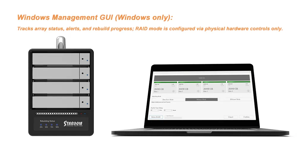 ● Windows Management GUI (Windows only): Tracks array status, alerts, and rebuild progress; RAID mode is configured via physical hardware controls only.