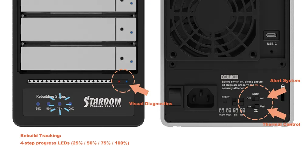 | Monitoring & protection | RAID rebuild progress (25% / 50% / 75% / 100%) Overheat / fan failure LED + buzzer alerts Intelligent power-stabilization logic |