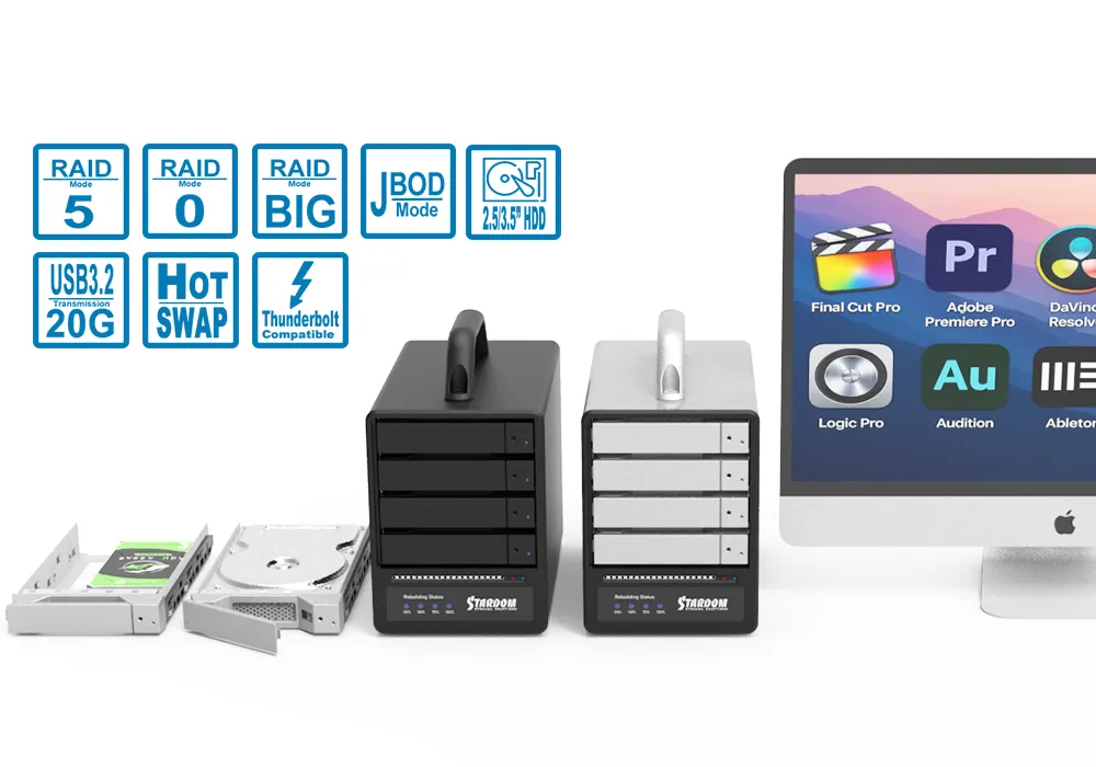 A: The SR4-B32 is the hardware RAID option in STARDOM’s 4-bay lineup, adding RAID modes (including RAID 5) for data protection and sustained workflow continuity. By contrast, ST4-B31 and ST4-B32 are JBOD enclosures designed for independent-drive expansion (no RAID). For connectivity, all three use USB-C; SR4-B32 can also be used with Thunderbolt™ 3/4 hosts when connected as a USB storage device (performance follows USB negotiation).