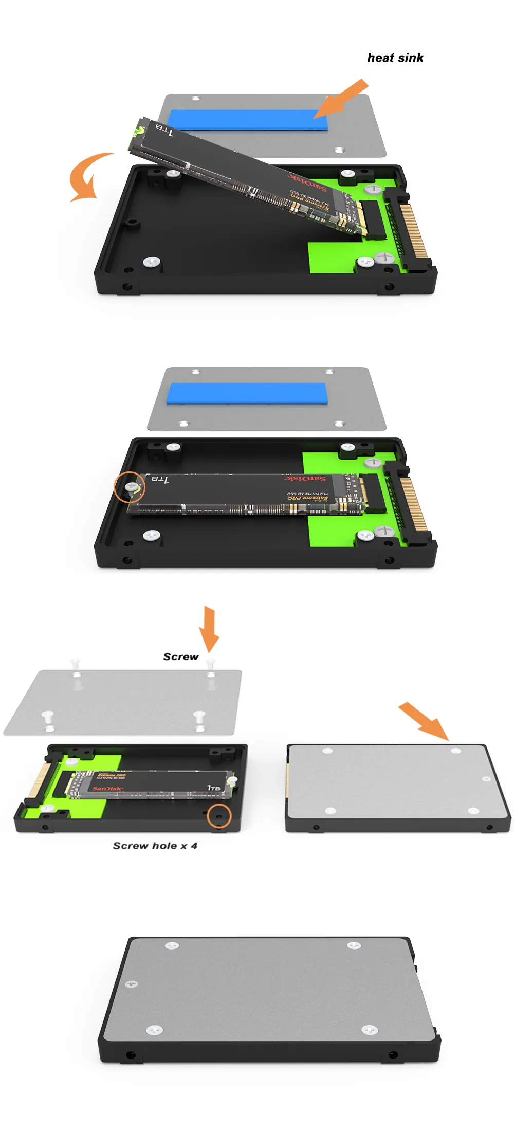 Protects the bare M.2 module in a 2.5" carrier that’s easier to handle, label, inventory, and replace in data-center or field environments. (General industry practice for U.2 serviceability.)