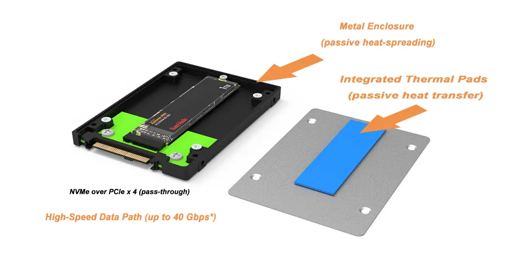 Thermal pads and a metal heat-spreading chassis help limit temperature-induced throttling for more consistent throughput over long transfers.