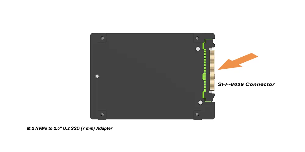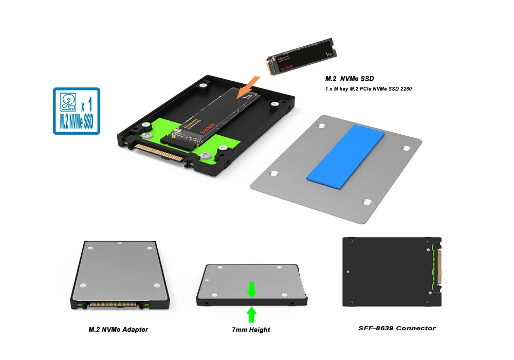 Converts an M.2 2280 NVMe SSD into a standard 2.5" U.2 SSD (7 mm z-height) for tight-space installations and dense drive bays.