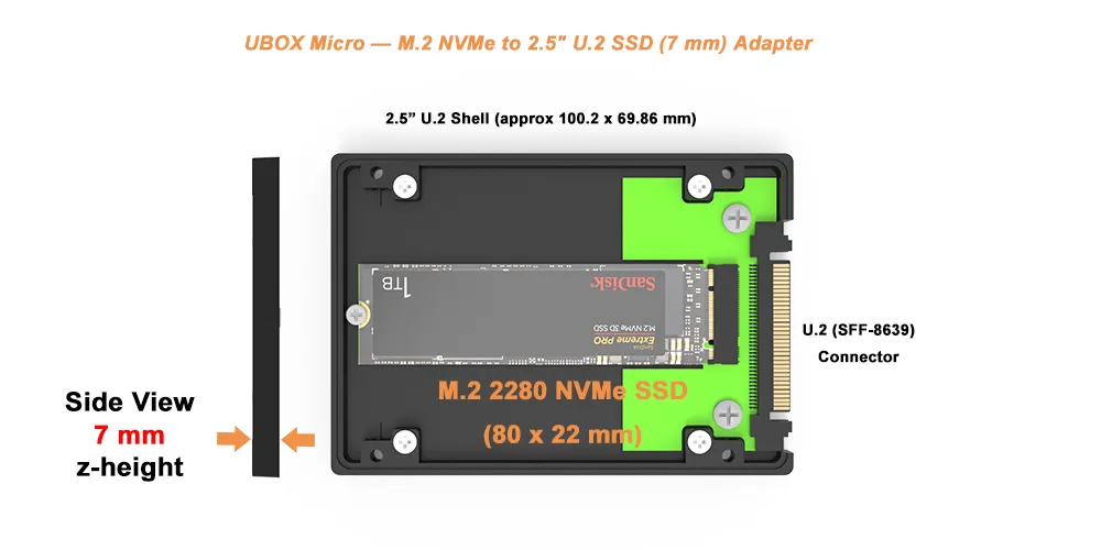 UBOX Micro is a high-performance, ultra-slim adapter that converts a standard M.2 2280 NVMe SSD (22 × 80 mm) into a 7 mm-thick, 2.5-inch U.2 SSD. It’s a flexible, durable upgrade path for servers, workstations, and embedded/industrial systems that rely on U.2 bays and backplanes. By aligning to the U.2 (formerly SFF-8639) standard and supporting up to four PCIe lanes via NVMe, UBOX Micro lets you deploy fast M.2 storage in hot-swap U.2 infrastructures with minimal friction.
