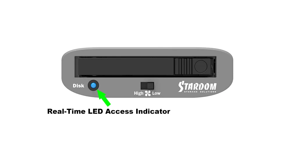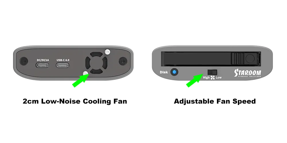 2 cm low-noise fan with adjustable Hi/Low speed switch keeps your drive cool under heavy workloads while maintaining a quiet environment.