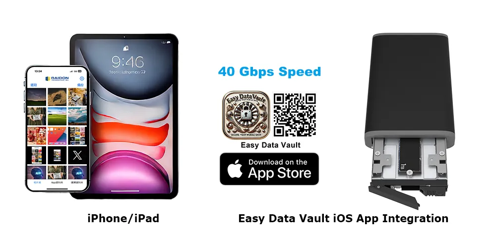 With seamless integration into the Easy Data Vault iOS app, the MU1-B4 extends high-speed storage beyond the desktop, enabling real-time file access, backup, and secure data management directly from iPhone and iPad — wherever your work takes you.