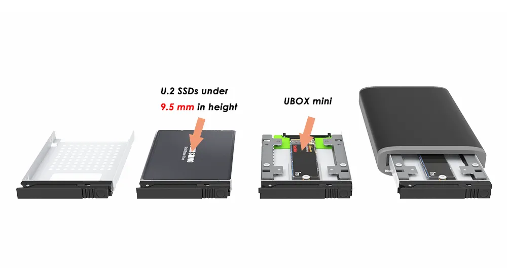 With the included UBOX mini adapter, supports M.2 NVMe SSDs in 2242 / 2260 / 2280 form factors.