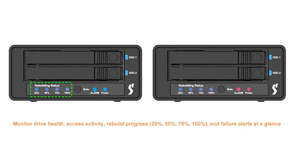 Monitor drive health, access activity, rebuild progress (25%, 50%, 75%, 100%), and failure alerts at a glance.