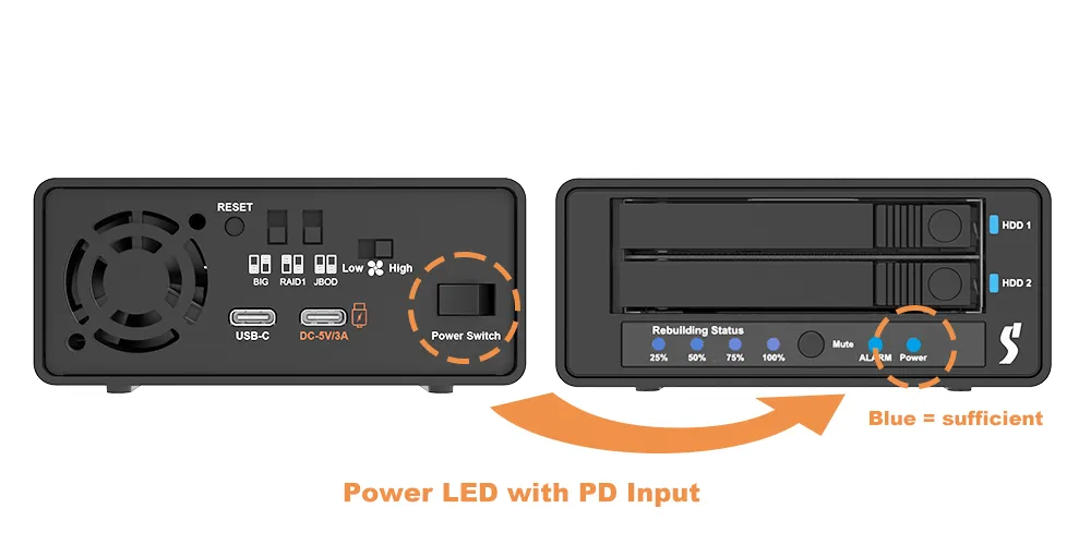 The USB-C PD 5V/3A input includes a Power LED to confirm power sufficiency: Blue = sufficient, Red = insufficient (do not power on if Red)