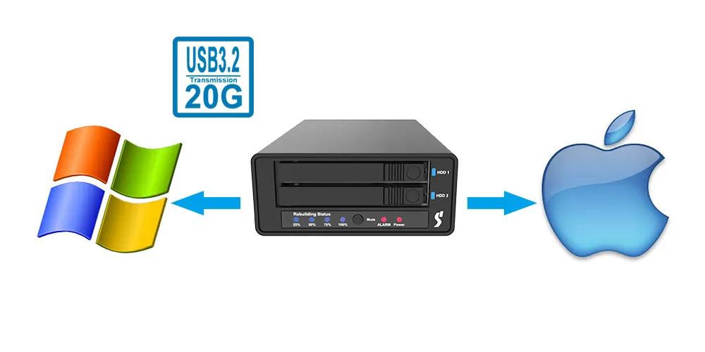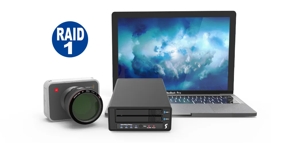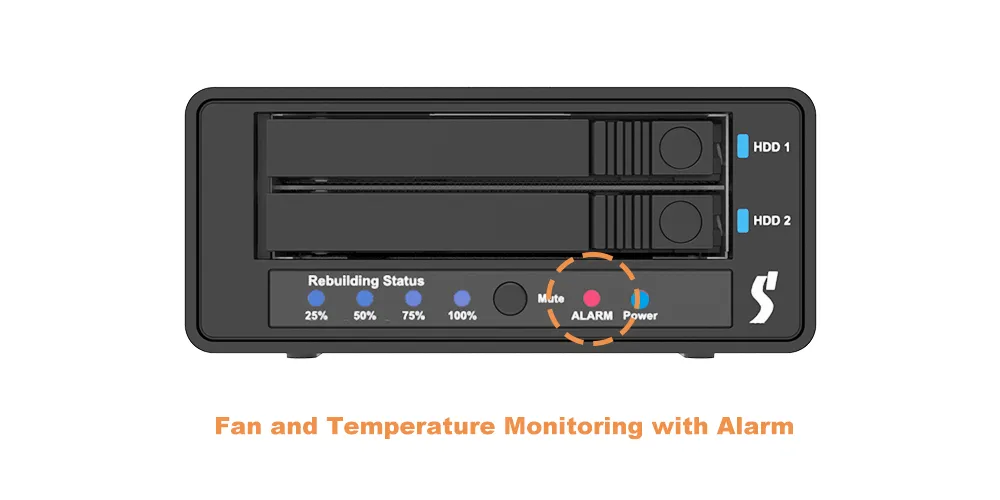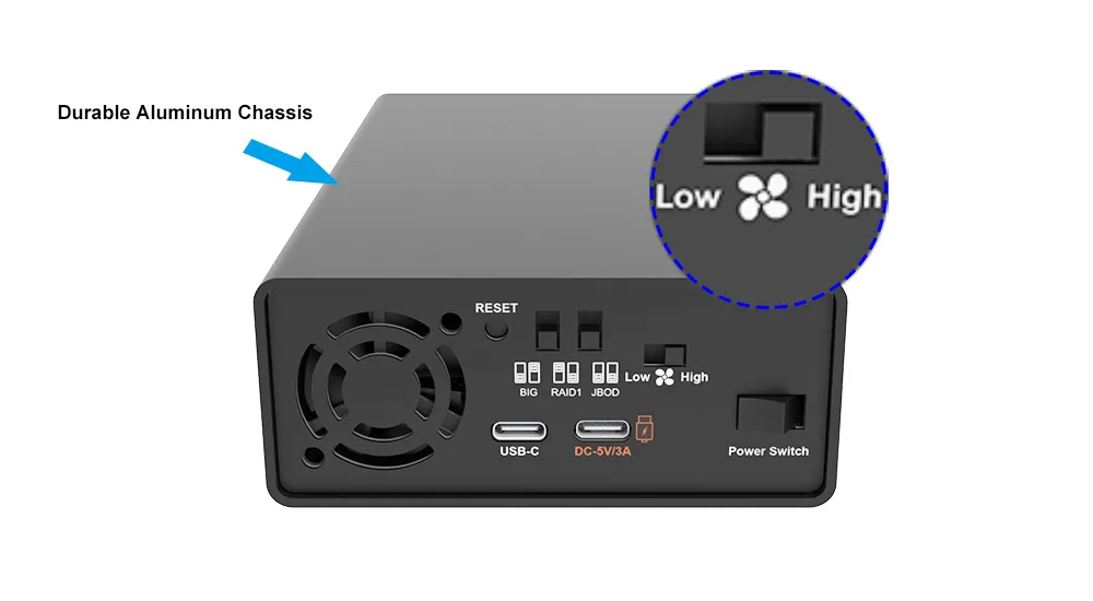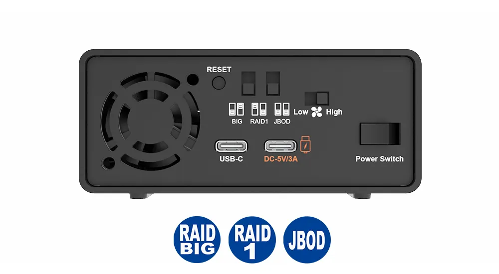 Supports RAID 1 for redundancy, JBOD for independent disks, and BIG for combined capacity—switch modes easily with the onboard selector.