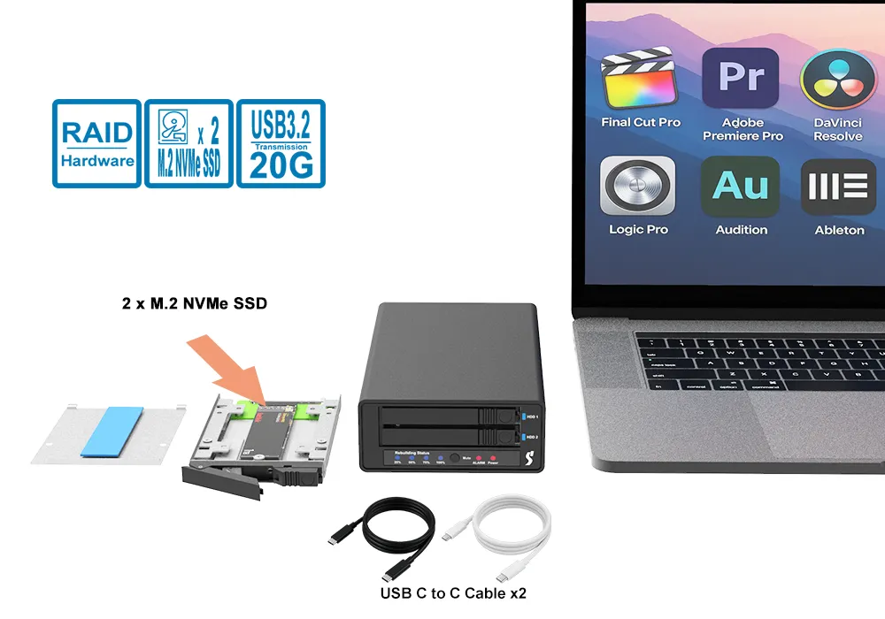 A dual-bay M.2 NVMe hardware RAID enclosure with USB 3.2 Gen 2x2 connectivity for high-speed external storage.