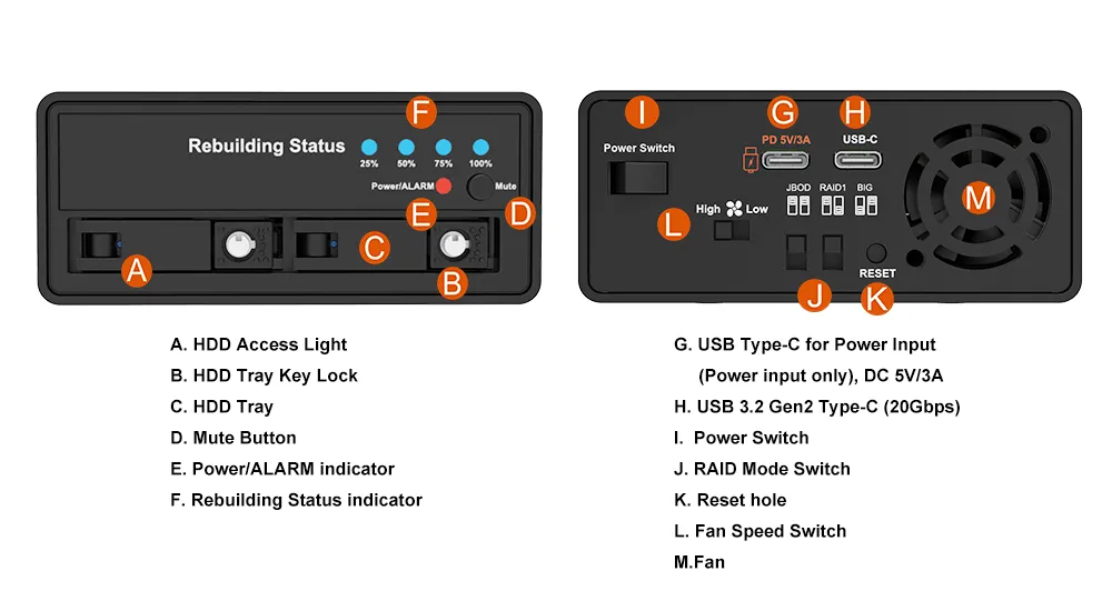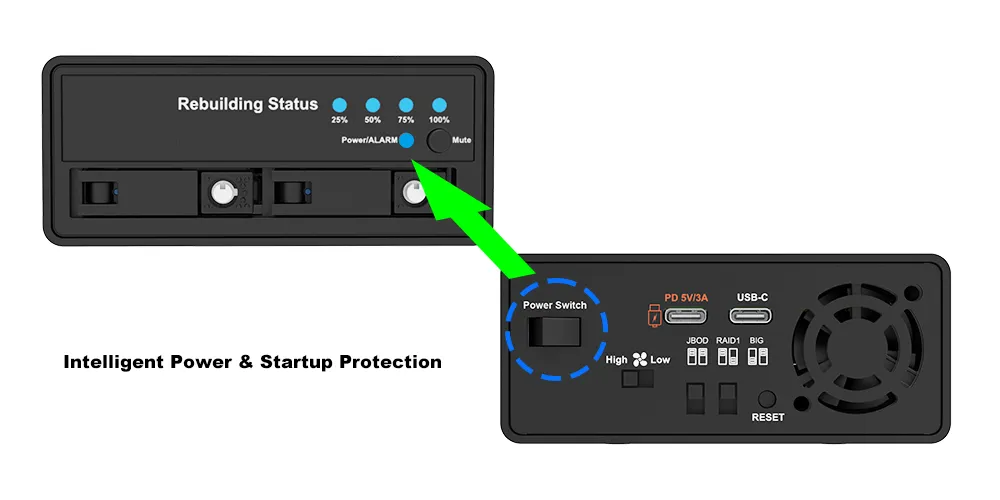 | Monitoring & protection | RAID rebuild progress (25% / 50% / 75% / 100%) Overheat / fan failure LED + buzzer alerts Intelligent power-stabilization logic |