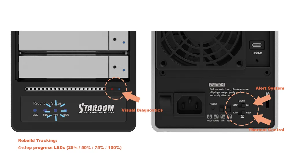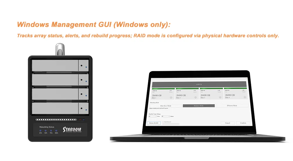 ● RAID mode is configured through hardware controls; Windows users can use the optional GUI to monitor system status and alerts