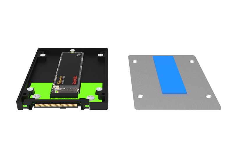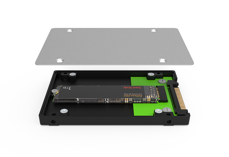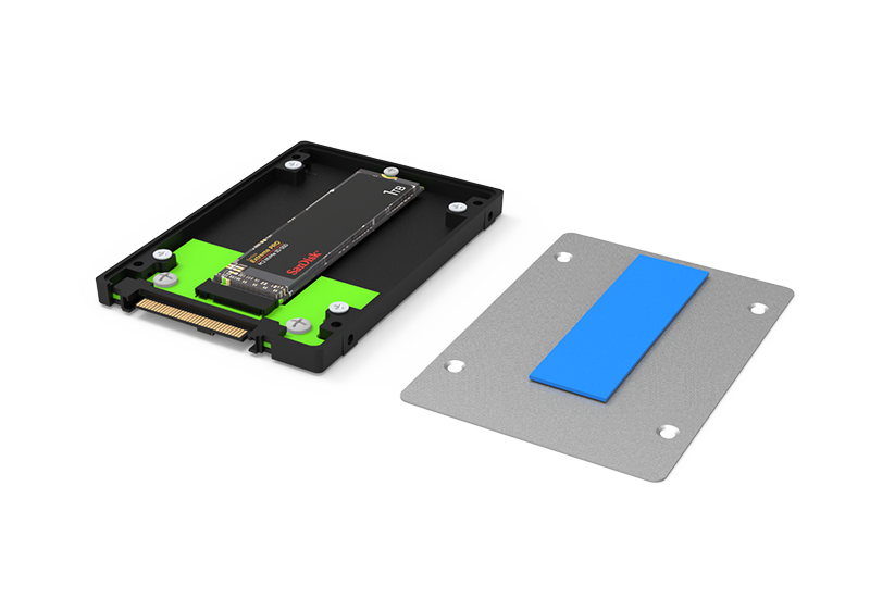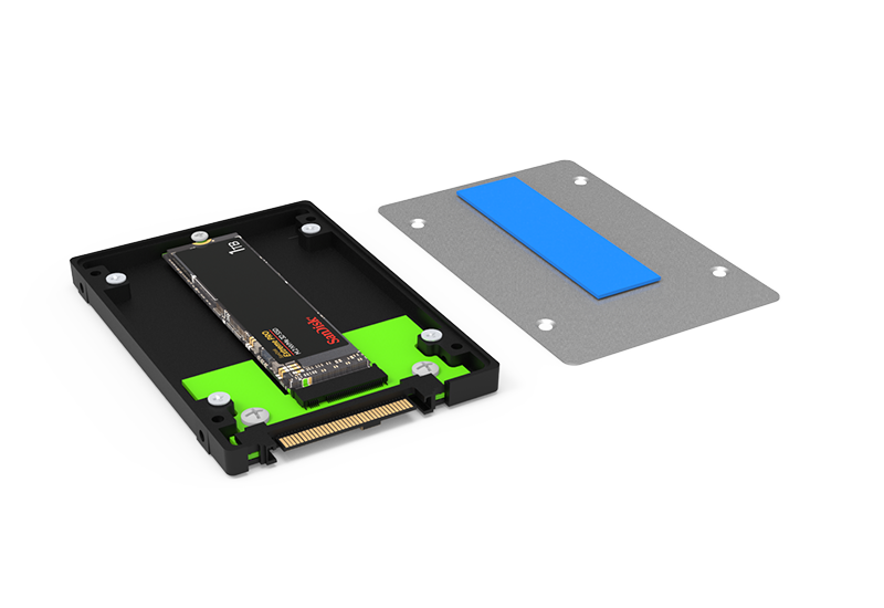 Converts an M.2 2280 NVMe SSD into a standard 2.5" U.2 NVMe SSD (7 mm z-height) for tight-space installations and dense drive bays.