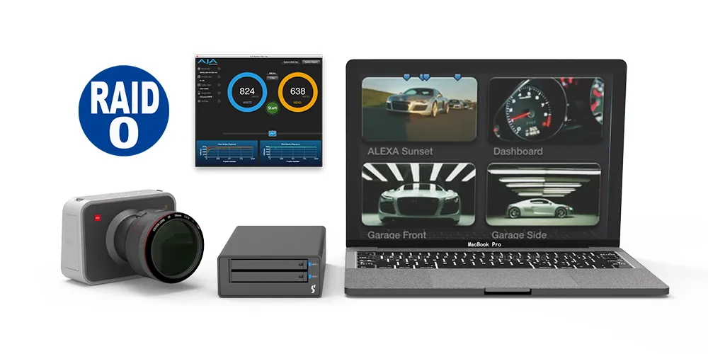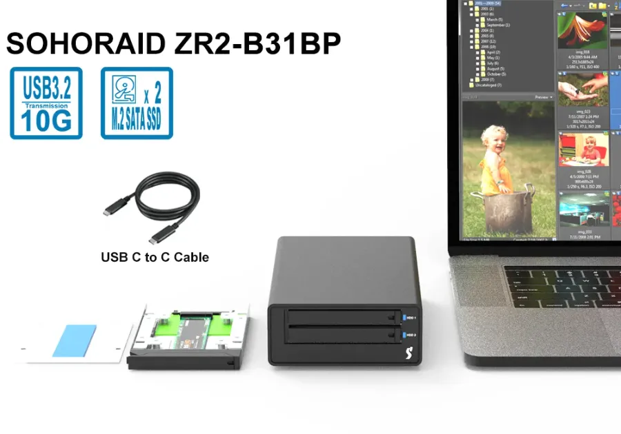 Since ZR2-B31BP provides USB 3.2 Gen 2 port, just use your MacBook Pro with Thunderbolt™ 3 (USB-C) interface, you could set up your own full function photo studio and could save tons of RAW images at any time. And you could edit and browse the large images database quickly when set up the RAID 0 mode. (Using SSD, the measured Write is about 824MB / Read is about 638 MB, the performance will be vary depending on the environment).
