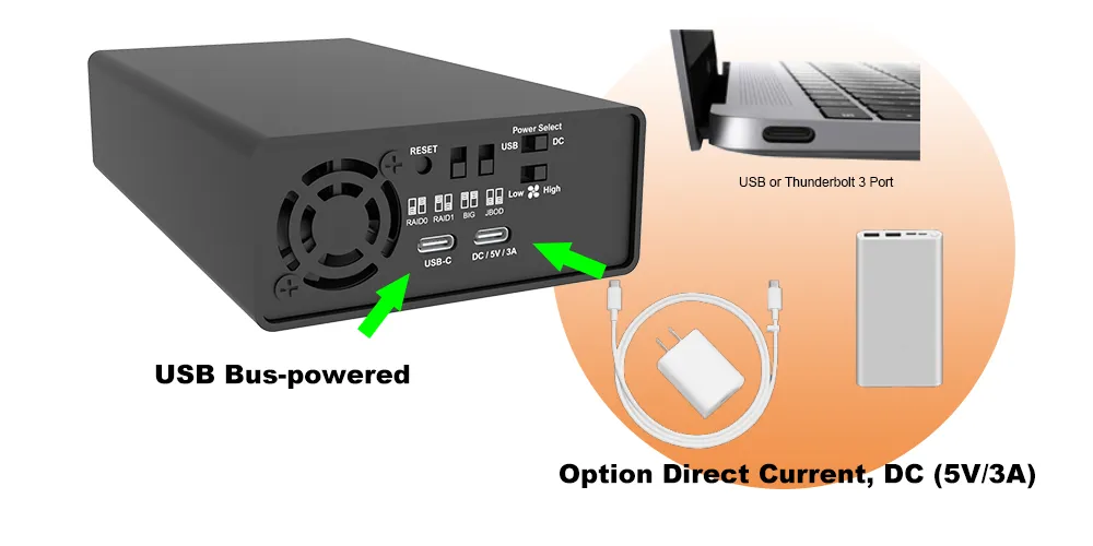 Compact and portable, comes with RAID 0/1/JBOD/BIG modes, suitable for various applications, Selectable powered by USB Bus-power or DC input