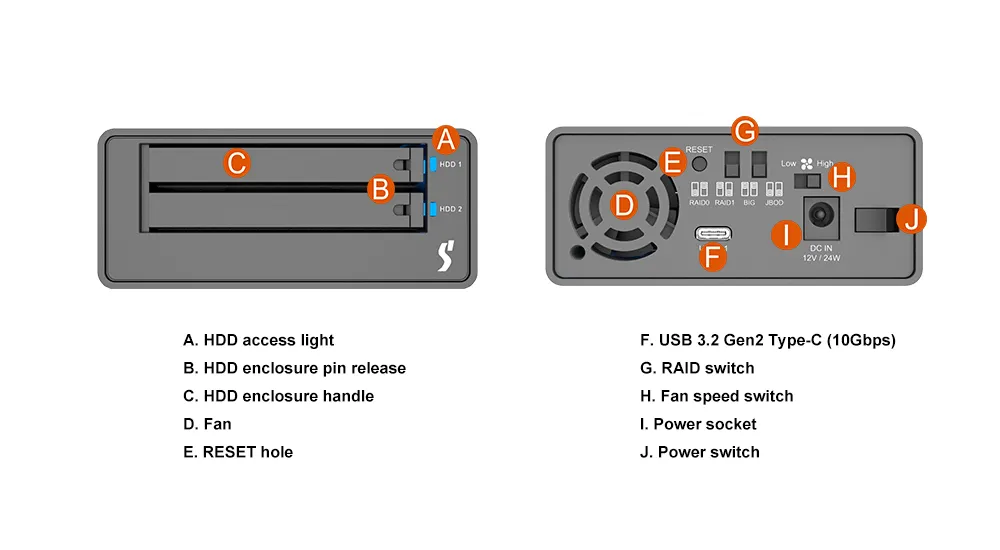 The ZR2-B31 is equipped with SATA 6G capabilities, ensuring swift data transfer rates. Further enhancing its versatility is an integrated RAID mode switch, allowing users to swiftly toggle between RAID 0, RAID 1, JBOD, and Big configurations. This feature not only optimizes storage performance but also offers varying levels of data redundancy and management based on user preferences.