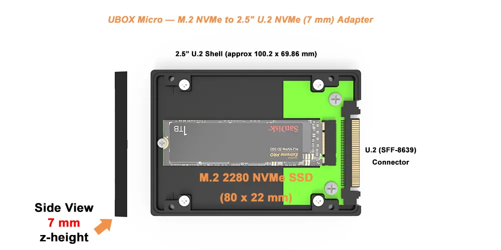 UBOX Micro is a high-performance, ultra-slim adapter that converts a standard M.2 2280 NVMe SSD (22 × 80 mm) into a 7 mm-thick, 2.5-inch U.2 NVMe SSD. It’s a flexible, durable upgrade path for servers, workstations, and embedded/industrial systems that rely on U.2 bays and backplanes. By aligning to the U.2 (formerly SFF-8639) standard and supporting up to four PCIe lanes via NVMe, UBOX Micro lets you deploy fast M.2 storage in hot-swap U.2 infrastructures with minimal friction.