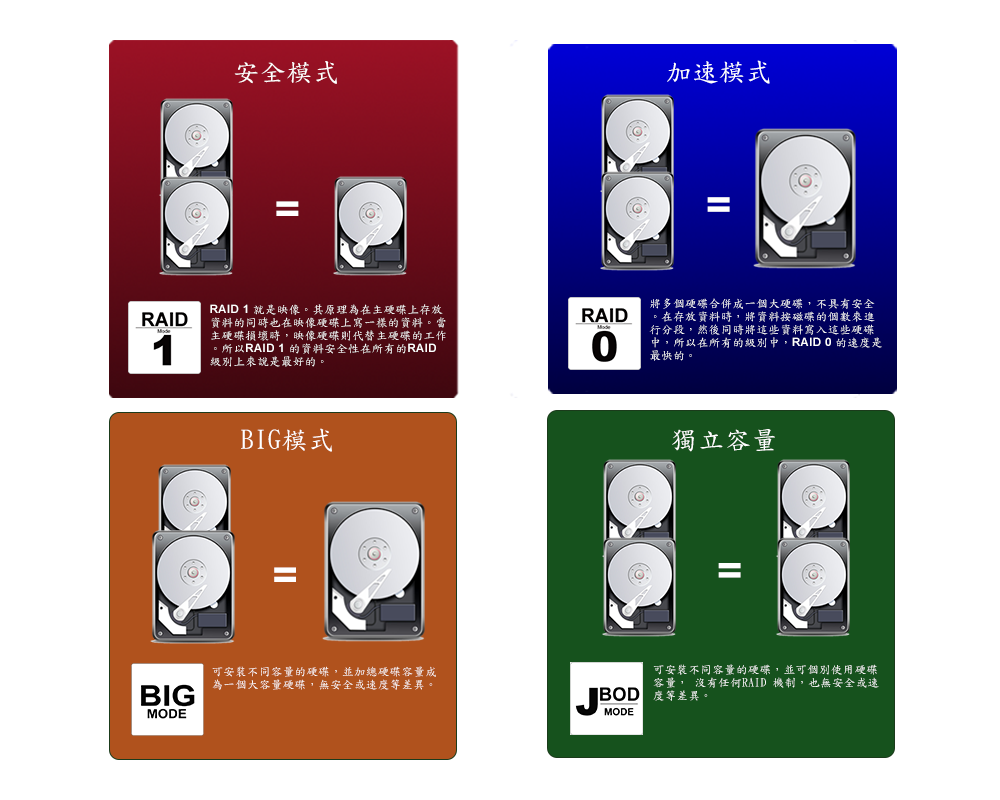 | 儲存模式 | BIG - 二顆硬碟容量加總 JBOD - 獨立容量 RAID 0 - 速度模式 RAID 1 - 安全模式 |