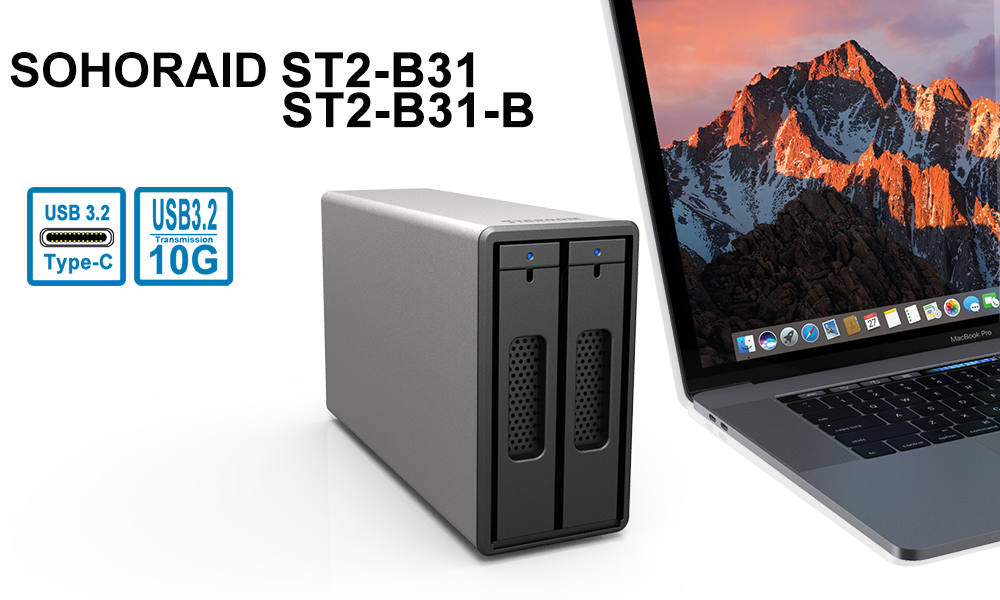 ST2-B31配備 BIG/ JBOD / RAID 0 / RAID 1 存儲模式,使用者可以通過 ST2-B31 的 USB 3.2 Gen 2傳輸介面,連接 Macbook Pro 的 Thunderbolt 3 (USB-C) 介面或直接連接 iMac Pro 的 Thunderbolt 3 (USB-C) 介面,傳送高達10Gbps的速度。無論是用於資料搜索、照片編輯、或觀看4K高畫質影片,ST2-B31都將帶給您無比愉悅的視訊與影音的優質享受。