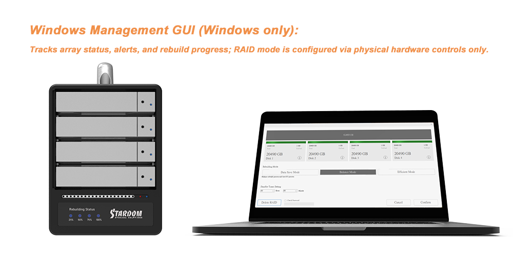 ● Windows Management GUI (Windows only): Tracks array status, alerts, and rebuild progress; RAID mode is configured via physical hardware controls only.