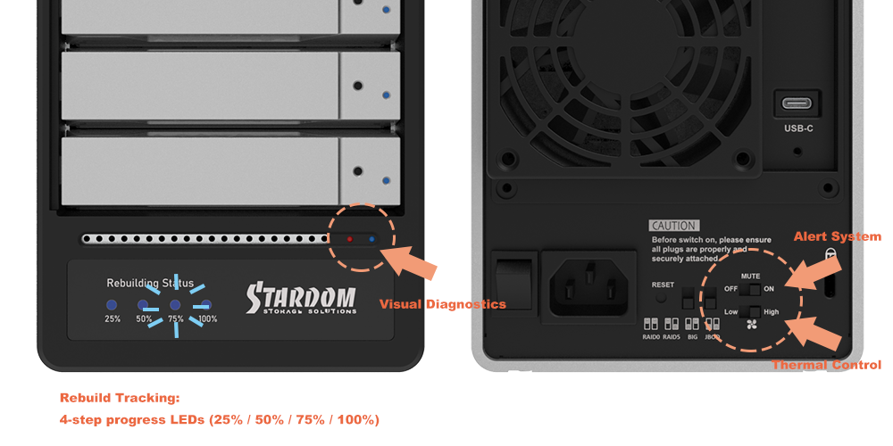 ● Rebuild Tracking: 4-step progress LEDs (25% / 50% / 75% / 100%).