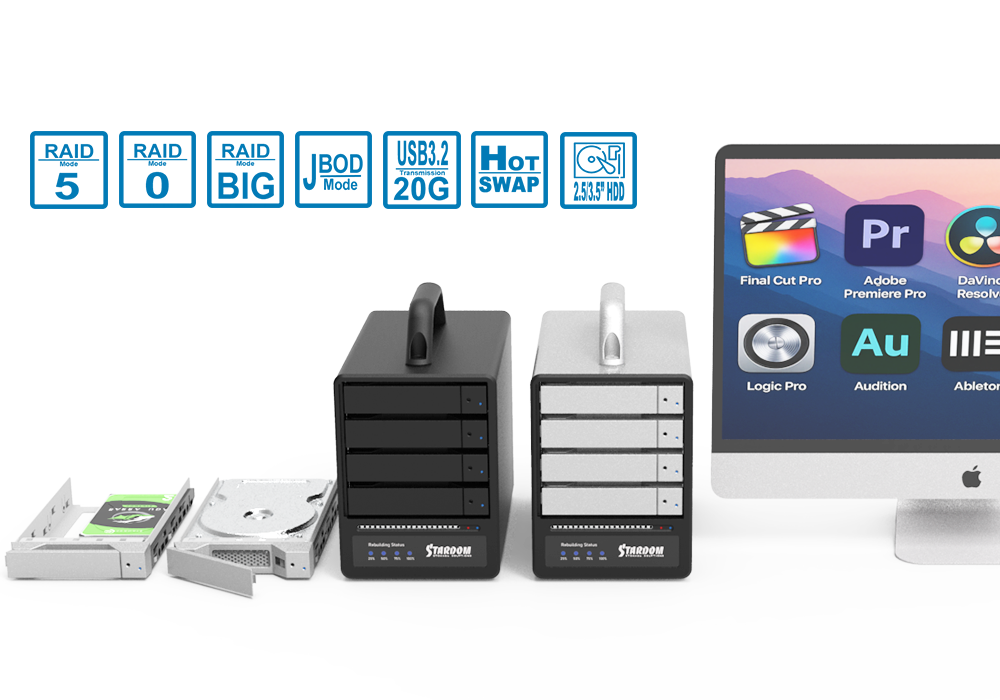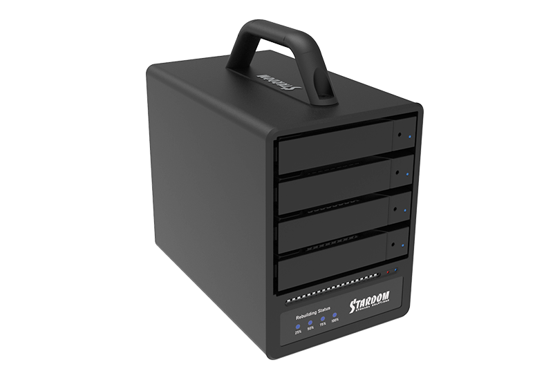 A: The SR4-B32 is the hardware RAID option in STARDOM’s 4-bay lineup, adding RAID modes (including RAID 5) for data protection and sustained workflow continuity. By contrast, ST4-B31 and ST4-B32 are JBOD enclosures designed for independent-drive expansion (no RAID). For connectivity, all three use USB-C; SR4-B32 can also be used with Thunderbolt™ 3/4 hosts when connected as a USB storage device (performance follows USB negotiation).